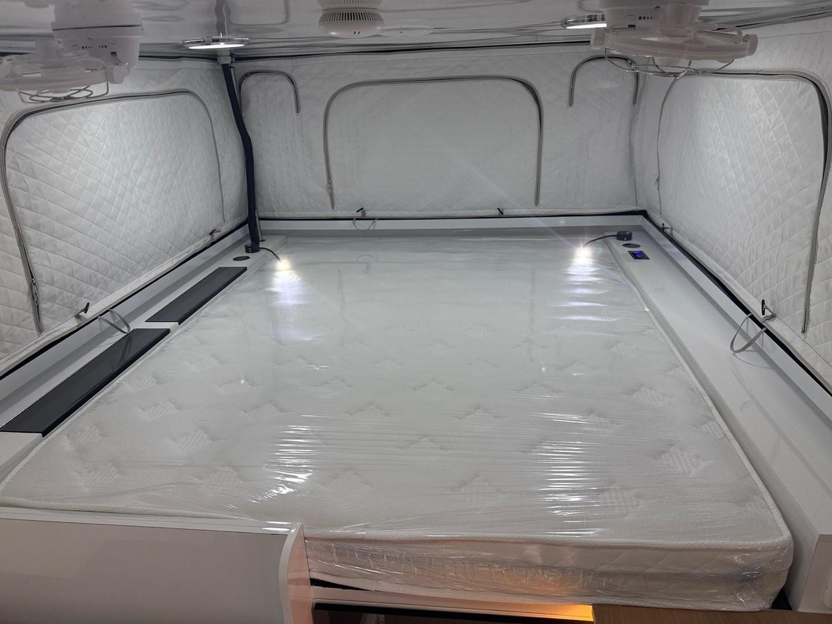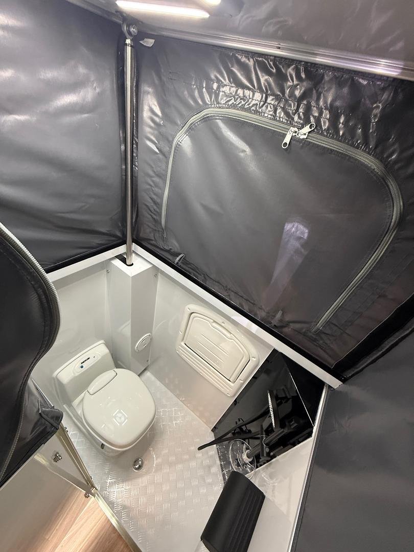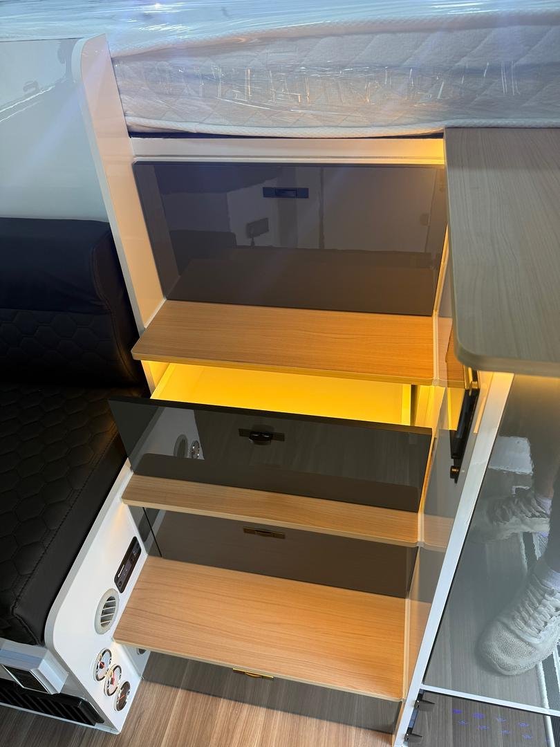 There’s also a clever pass-through hatch allowing appliances like your coffee machine to be accessed from inside or outside — a thoughtful feature for flexible camp setups.
